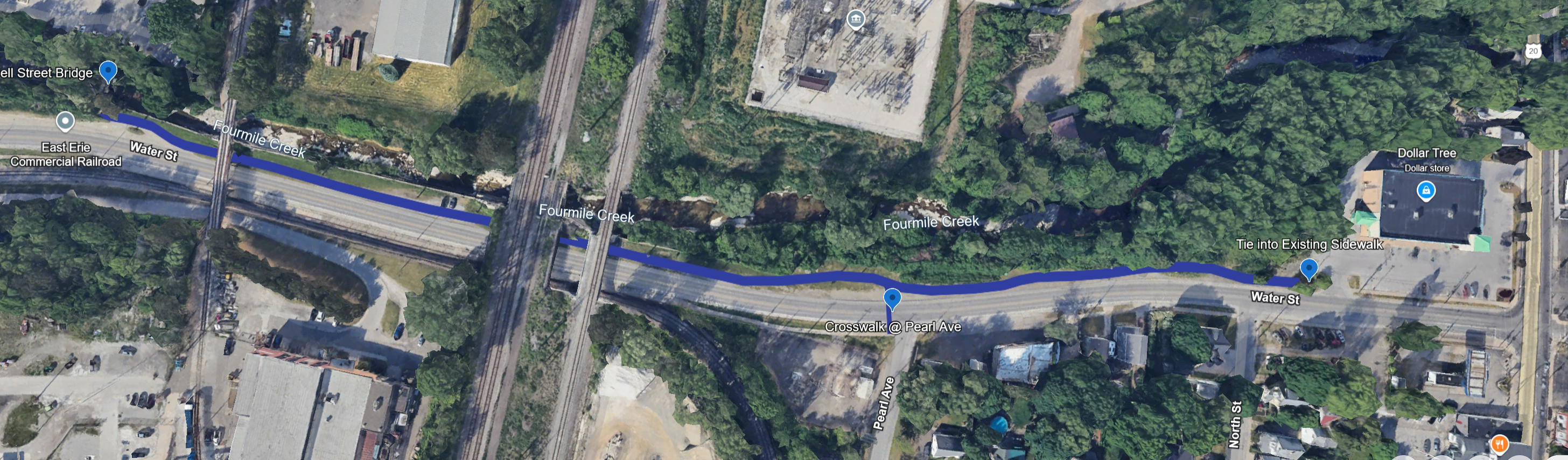 In accordance with roadway safety guidelines and PennDOT standards, a mid-block pedestrian crossing cannot be installed at the bridge location due to the increased risk of vehicle–pedestrian conflicts and strikes. Instead, a crosswalk will be added at Pearl Avenue, so that between Bell Street and Water Street there will be a continuous pedestrian walkway along the east side of the road.